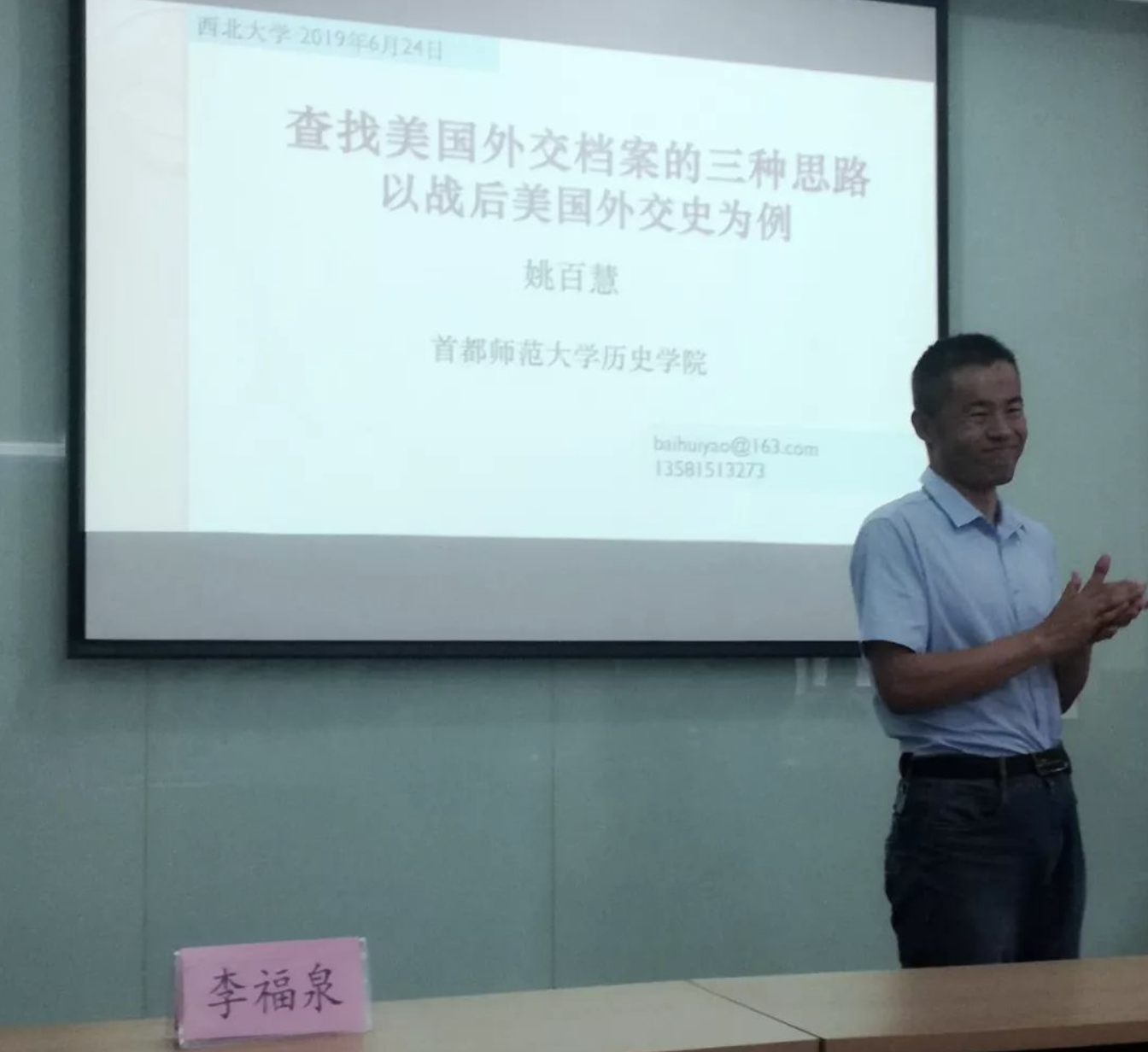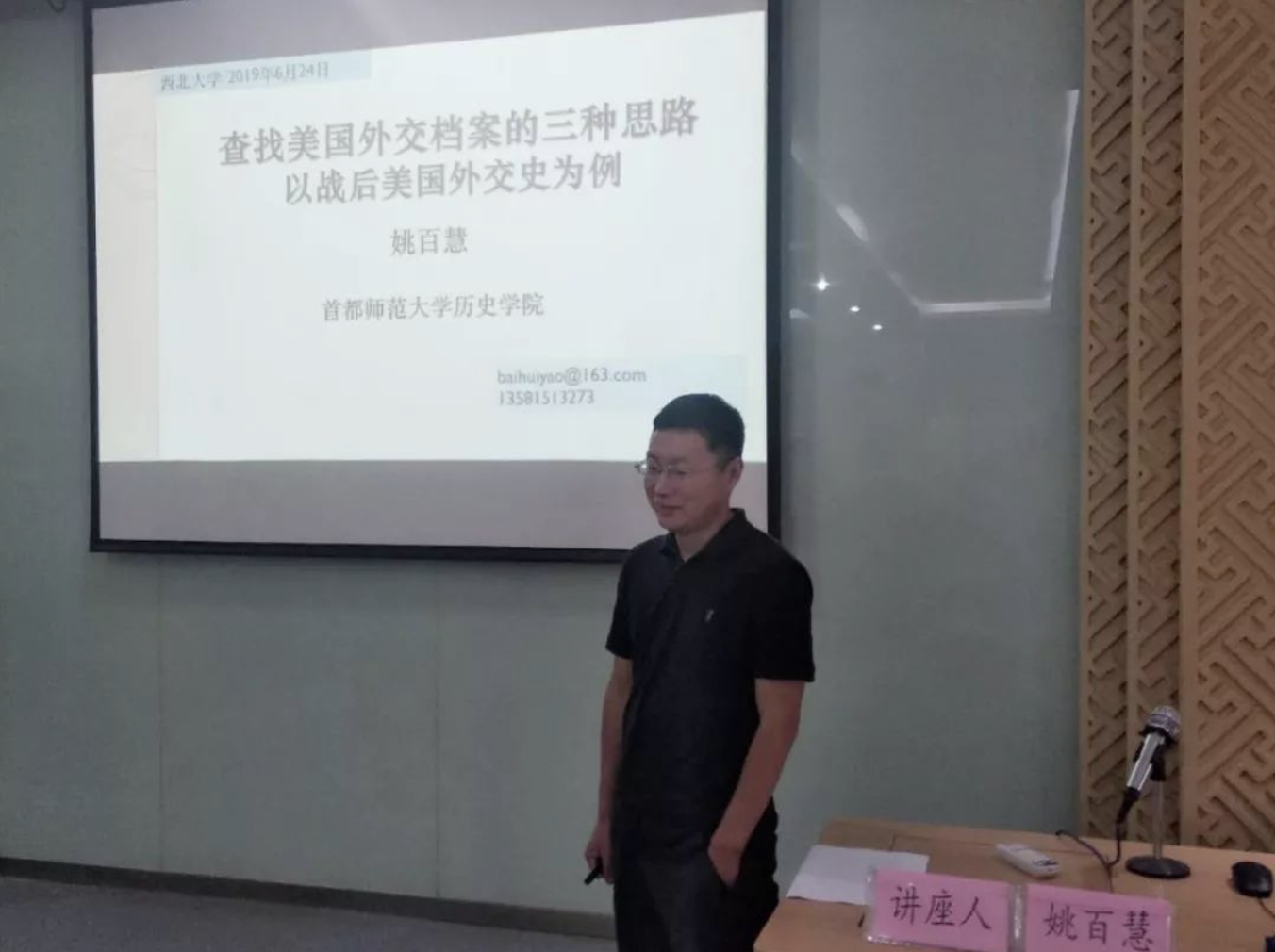 2019年6月24日,西北大学中东研究所在太白校区地质系201教室举办了“中东高端讲座”第三讲,首都师范大学历史学院副院长姚百慧教授做了题为“查找美国外交档案的三种思路”的学术讲座。报告由西北大学中东研究所副所长李福泉教授主持,中东研究所博硕士60余人参加。