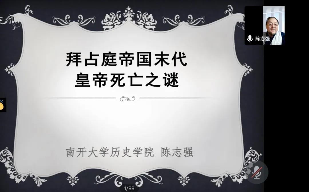 2021年1月11日,西北大学中东研究所在线上举办“世界历史名家讲座”第一讲。此次讲座邀请了国内拜占庭帝国研究的资深学者、南开大学希腊研究中心主任陈志强教授讲授,题目为“拜占庭帝国末代皇帝死亡之谜”。讲座由西北大学中东研究所所长韩志斌教授主持,线上来自全国各地的300多名听众共同聆听了本次讲座。