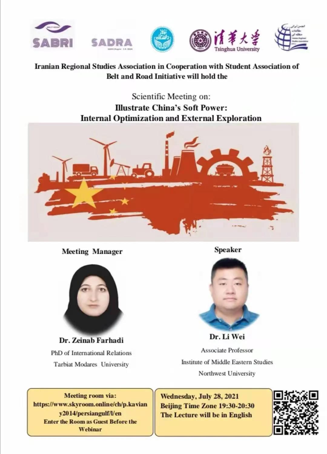 2021年7月28日,由伊朗德黑兰大学区域研究协会和清华大学一带一路战略研究院联合主办的专题讲座在线上举行,主讲人李玮副教授带来题为“中国的软实力:内部优化与外部探索”的专题讲座。李玮副教授于韩国高丽大学获得国际关系学哲学博士,现为西北大学中东研究所副教授,主要从事国际关系理论、中东地区安全研究。讲座由伊朗师范大学的法尔哈蒂博士主持,近20位伊朗和中国研究生参加。