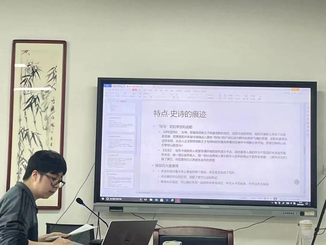 硕士生李怡彬从特征与原因两方面阐述了史诗与历史学的联系与区别。李怡彬认为,史诗从神意出发解释人类的行为,历史学则以明辨真假为基本原则。在史诗转向历史学的过程中,公元六世纪哲学的兴起起到了关键作用。此外,李怡彬详细讲述了Historia语义的演变过程,从最初强调“实地观察”演变为后期“通过收集和甄别证据用人的理性评判来获取知识”。最后,李怡彬总结了《历史》的几点特点,即叙事风格带有史实的痕迹、内容方面政治与军事并重,历史观上主张文明对立。