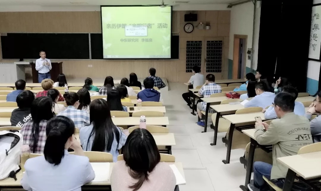 2019年5月28日晚,西北大学中东研究所在西北大学太白校区教学楼7111举办了“导师讲坛”第124讲,中东研究所副所长李福泉教授做了题为“亲历伊朗‘光明行者’活动”的学术报告。报告由中东研究所王猛副研究员主持,全校师生50余人参加。