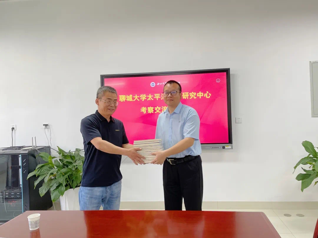 韩志斌教授主持座谈会,代表中东研究所对来访客人表示热烈欢迎。李福泉教授和闫伟教授介绍了中东研究所的历史沿革和发展情况。聊城大学太平洋岛国研究中心赵少峰教授对聊城大学历史文化与旅游学院和太平洋岛国研究中心的建设情况进行了详细的介绍。随后双方围绕学术研究、人才培养、智库建设等进行了深入的讨论,彼此都希望能加强联系推进双方的交流与合作。最后,双方进行了赠书仪式。