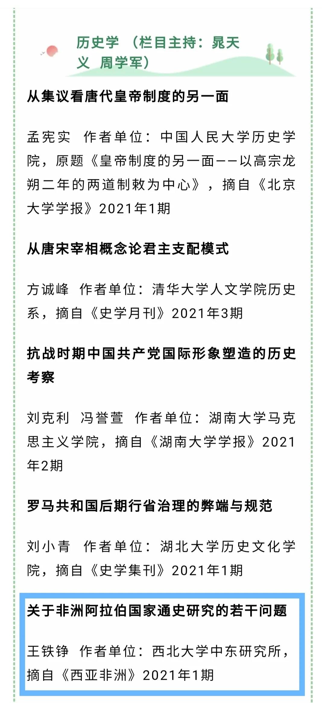 西北大学中东研究所王铁铮教授的《关于非洲阿拉伯国家通史研究的若干问题 》文章被《中国社会科学文摘》2021年第7期全文转载。该文发表于《西亚非洲》2021年第1期。