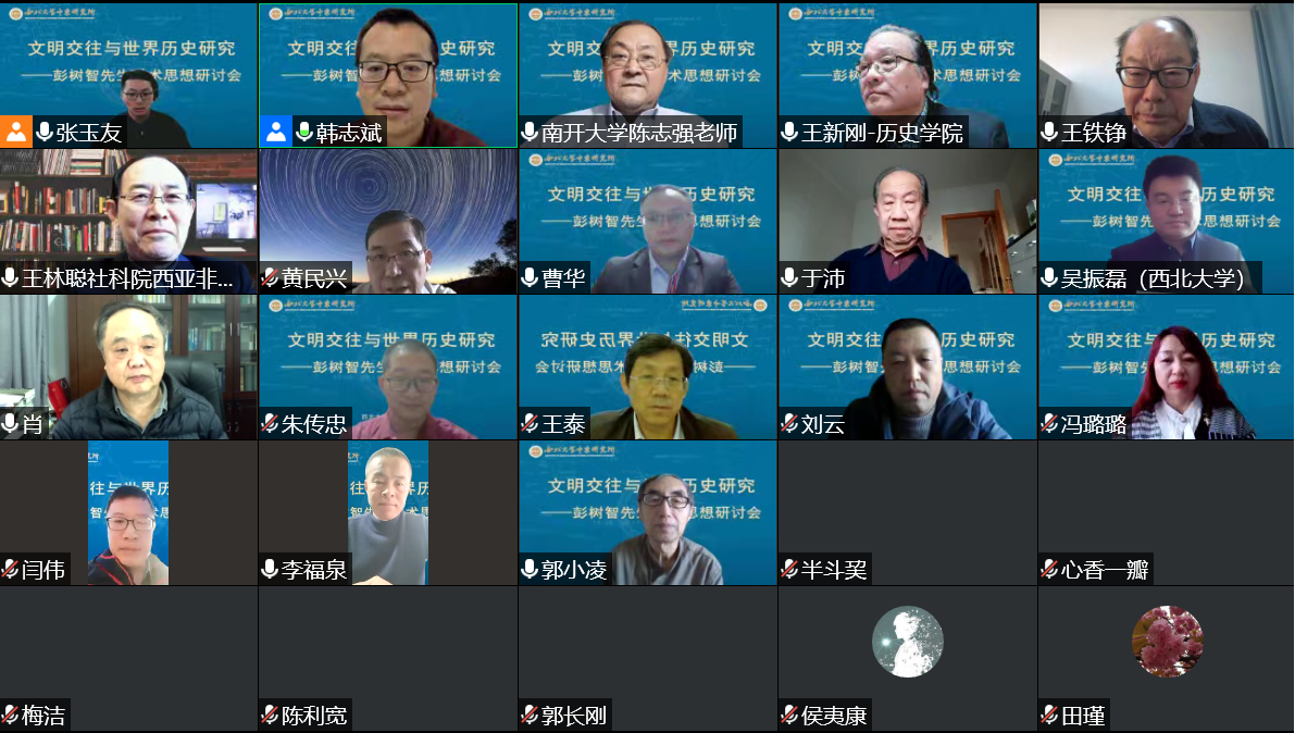 2021年12月18日,由西北大学中东研究所主办的“文明交往与世界历史研究”彭树智先生学术思想研讨会隆重举行,来自中国社会科学院、中国人民解放军军事科学院、上海社会科学院、中国人民大学、北京师范大学、西安交通大学、西北工业大学、南开大学、四川大学、兰州大学、上海外国语大学、上海大学、郑州大学、云南大学、西南大学、陕西师范大学、华南师范大学、宁夏大学、北京语言大学、浙江师范大学、山西师范大学、河南师范大学、西北师范大学、西北民族大学、内蒙古民族大学、延安大学、河南财经政法大学、河南科技大学、重庆邮电大学、西安外国语大学、西安石油大学、陕西理工大学、西北政法大学、广东岭南师范学院、大庆师范学院、咸阳师范学院、西北大学等数十所高校和科研机构的九十余位专家学者参加本次会议。受疫情影响,本次研讨会为线上举行。