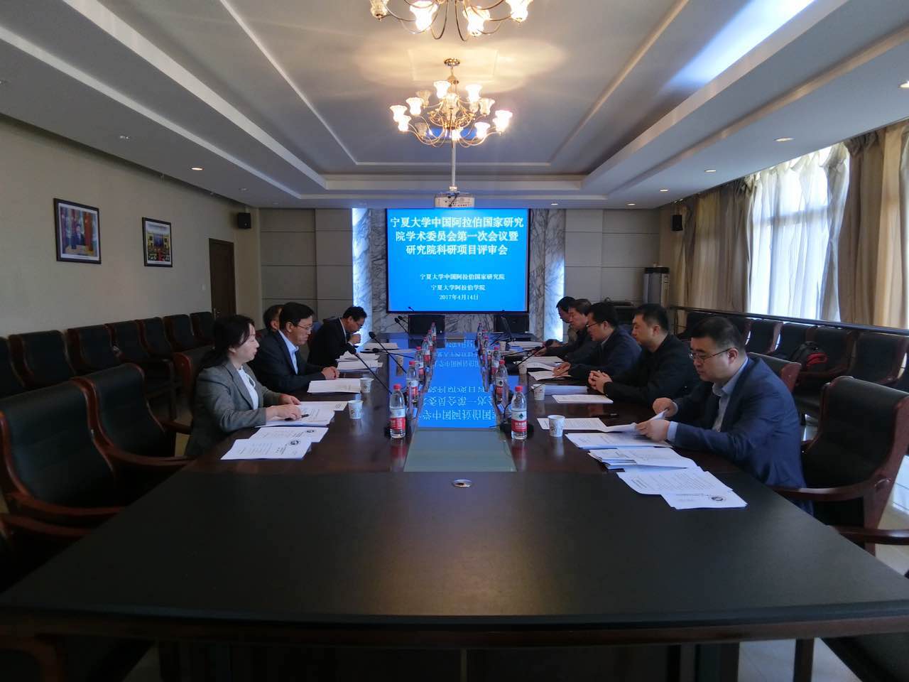 2017年4月14日上午8点钟,在宁夏大学中国阿拉伯国家研究院一楼会议室召开两院学术委员会第一次会议暨研究院开放性课题评审会,学术委员会主任委员杨圣敏教授主持会议,校长助理马涛教授出席并致辞。会上,杨圣敏主任宣读委员会名单,并由马涛教授向委员颁发聘书。委员会由西北大学中东研究所所长;上海外国语大学中东研究所所长刘中民教授;中国社科院西亚非洲研究所所长助理王林聪教授;宁夏社科联主席杨占武研究员;宁夏大学人文学院、回族研究院胡玉冰教授;中国阿拉伯国家研究院院长李绍先研究员;宁夏大学阿拉伯学院书记张前进;中国阿拉伯国家研究院金忠杰教授;中国阿拉伯国家研究院冯璐璐教授;宁夏大学阿拉伯学院姜克银教授等多位专家组成,涵盖北京、上海、西安、宁夏等地同类学术机构与学科专家。
