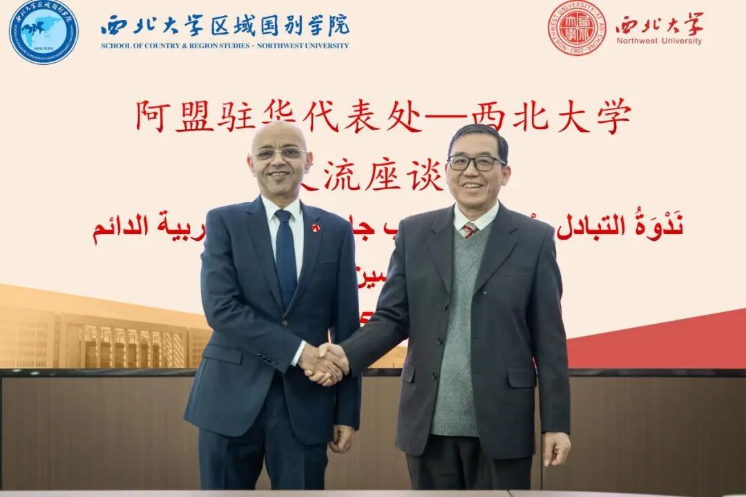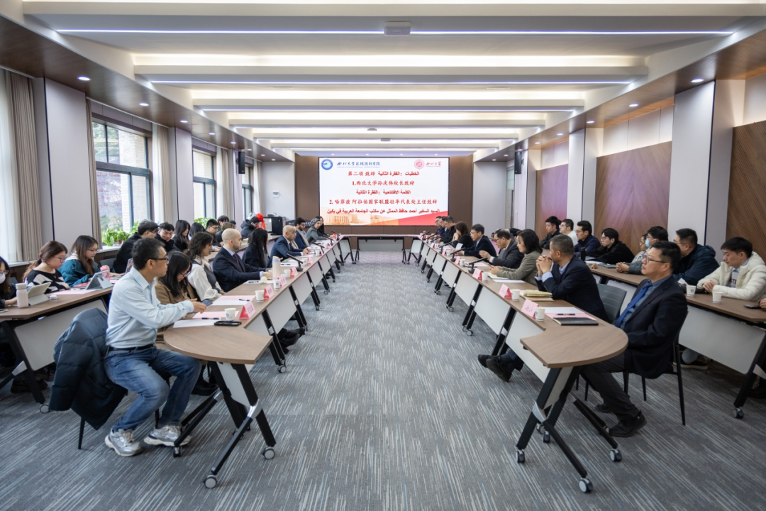 12月16日上午,我院举行阿拉伯国家联盟驻华代表处与西北大学交流座谈会。我校校长孙庆伟出席座谈会,并与来访的阿拉伯国家联盟驻华代表处主任艾哈迈德·穆斯塔法·法赫米·哈菲兹(Ahmed Mustafa Fahmy Hafez)共同为我院阿拉伯国家联盟研究中心揭牌。校党委常委、副校长范代娣主持座谈会,国际合作部、区域国别学院、外国语学院负责人及师生代表参加座谈。