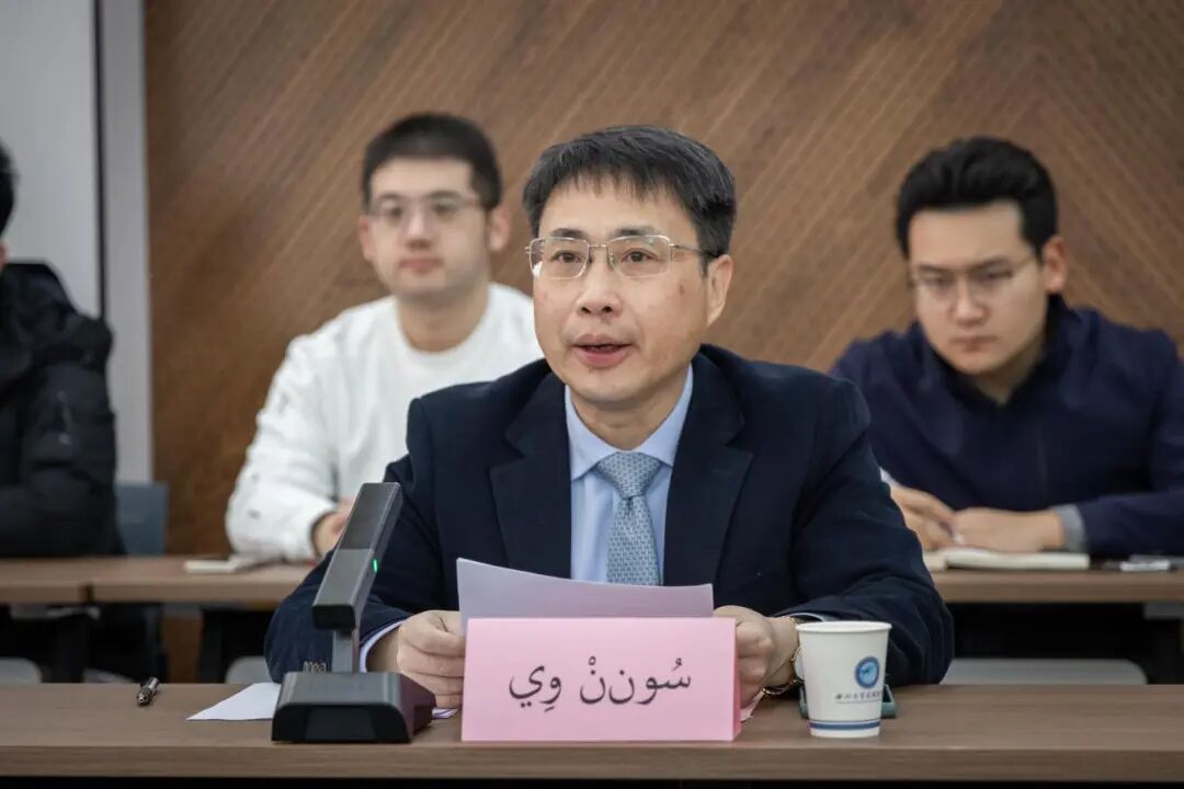 孙庆伟在座谈中介绍了学校历史发展和区域国别学科建设成效。他指出,学校拥有深厚的中东阿拉伯国家研究传统,近年来,学校充分发挥综合性学科优势,产出了系列重要成果,为推动中阿学术合作和文明交流互鉴发挥了重要作用。他表示,哈菲兹先生为推动中阿交流合作作出了重要贡献,此次来访并受聘荣誉教授,将有力地推动我校区域国别学科的建设发展。学校将进一步深化与阿拉伯国家高校、科研机构的交流合作,取得更多合作成果,为中阿文明交流互鉴注入新的活力,让跨越千年的丝路友谊在新时代绽放更加绚丽的光彩。