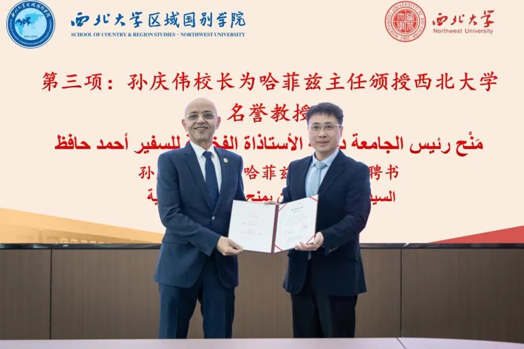 哈菲兹表示,非常荣幸在阿盟成立80周年再次到访西北大学并受聘学校荣誉教授。他说,西北大学区域国别学院将学术研究与中阿重大现实需求相结合,对阿拉伯国家历史和文明的研究搭建起了中阿现代学术丝绸之路,对中阿现实关系的政策建议为中阿交流合作作出了卓越贡献。期待阿盟驻华代表处与西北大学加强合作,共同为推动中阿人民相知相亲、促进“一带一路”高质量发展注入深厚而持久的学术文化动力。