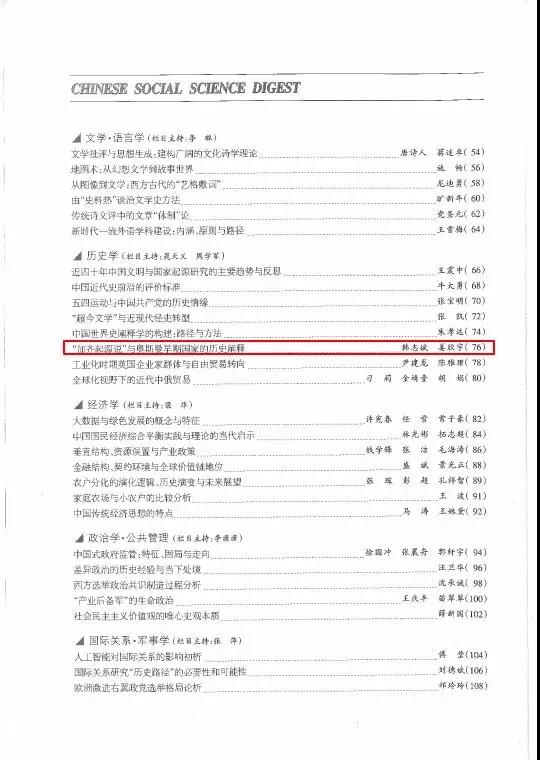 西北大学中东研究所所长韩志斌教授与硕士研究生姜欣宇合著文章《“加齐起源说”与奥斯曼早期国家的历史阐释》(载《世界历史》2019年第2期)被《中国社会科学文摘》2019年第8期全文转载。