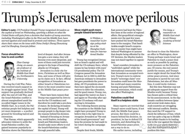 2017年12月6日,美国总统特朗普在白宫宣布,美国承认耶路撒冷为以色列首都,此事迅即在世界引起轩然大波。“China Daily”针对此事采访了西北大学中东研究所的赵广成副教授、上海国际问题研究院的李伟建研究员和中国社会科学院西亚非洲研究所的殷罡研究员,采访文章标题为《特朗普在耶路撒冷一事上铤而走险(Trump's Jerusalem move perilous)》。全文内容如下: