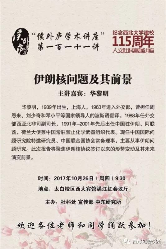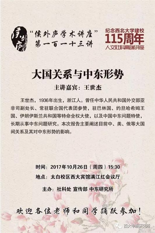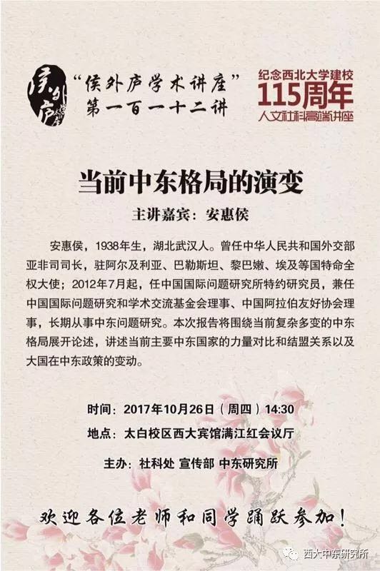 2017年10月26日,即本周四,将在西北大学举办中东研究所揭牌暨兼职教授聘任仪式。此次揭牌仪式,源自今年三月公示的教育部国别与区域研究中心备案,中东所作为历史悠久、早已形成研究实体的研究机构,不更名列入其中。除此次揭牌仪式,还将举行对王世杰、安惠侯、华黎明等三位兼职教授的聘任仪式,最后将由三位教授举行相关讲座。