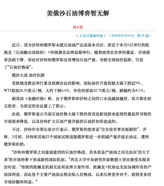 2020年4月9日,中东研究所副教授王晋博士就国际原油价格,接受了《人民日报海外版》的采访。(“美俄沙石油博弈暂缓解”,《人民日报海外版》,2020年4月9日,第06版)