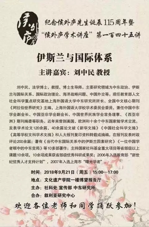 2018年9月21日,中东研究所将在太白校区文化遗产学院博望报告厅举办“纪念侯外庐先生诞辰115周年暨侯外庐学术讲座第一百四十五讲”,刘中民教授将带来题为“伊斯兰与国际体系”的学术讲座。详细情况如下: