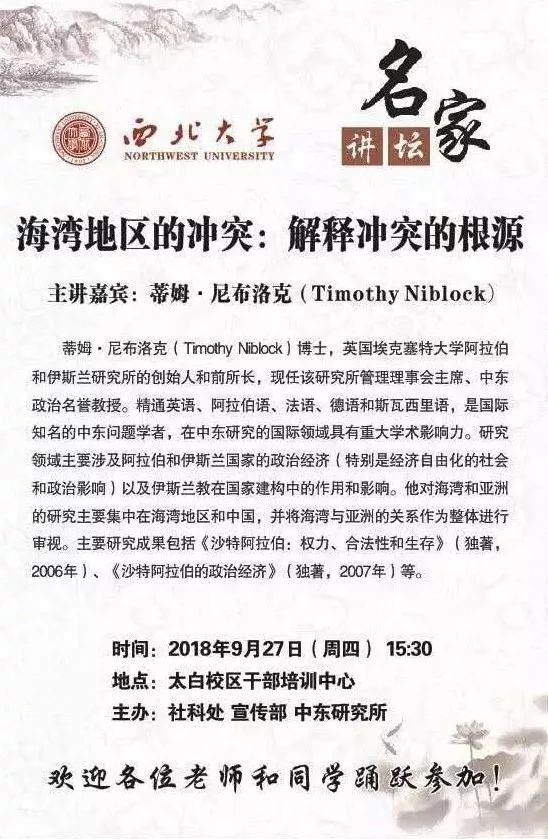 中东研究所即将举办蒂姆·尼布洛克教授的讲座