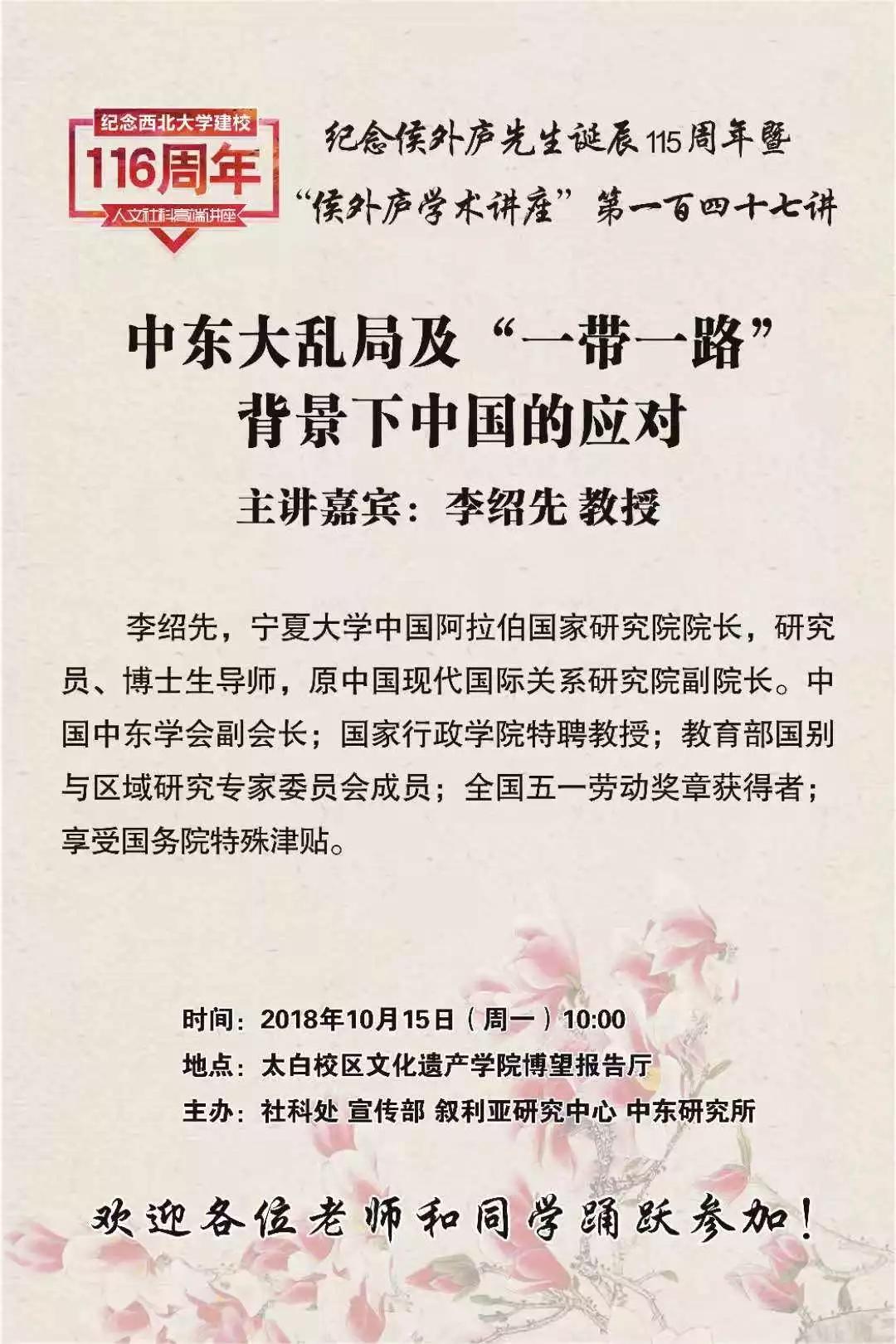 2018年10月15日,中东研究所将在太白校区文化遗产学院博望报告厅举办“纪念西北大学建校116周年、纪念侯外庐先生诞辰115周年暨侯外庐学术讲座第一百四十七讲”。李绍先教授将带来题为“中东大乱局及‘一带一路’背景下中国的应对”的学术讲座。详细情况如下: