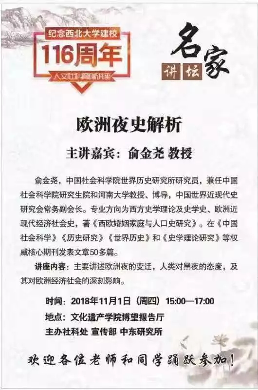 2018年11月1日下午,中东研究所将在西北大学太白校区文化遗产学院博望报告厅举办“名家讲坛”。中国社会科学院世界历史研究所俞金尧研究员将带来题为“欧洲夜史解析”的学术讲座。讲座由中东研究所所长韩志斌教授主持。详细情况如下: