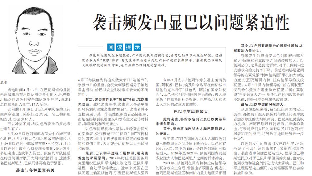 王晋:《袭击频发凸显巴以问题紧迫性》,《工人日报》,2022年4月15日第8版。