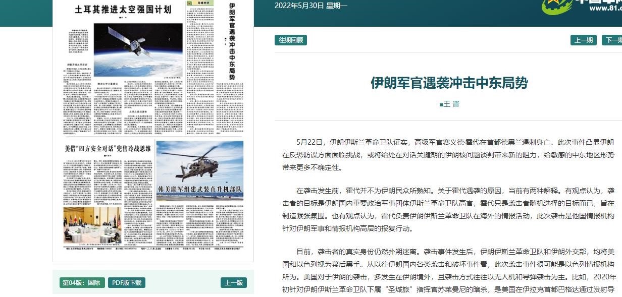 2022年5月30日,中东研究所副教授王晋在《解放军报》发表文章,分析了伊朗“伊斯兰革命卫队”高级军官遇袭后,对伊朗外交以及伊朗与美国关系的影响。详见王晋:《伊朗军官遇袭冲击中东局势》,《解放军报》,2022年5月30日,第4版。