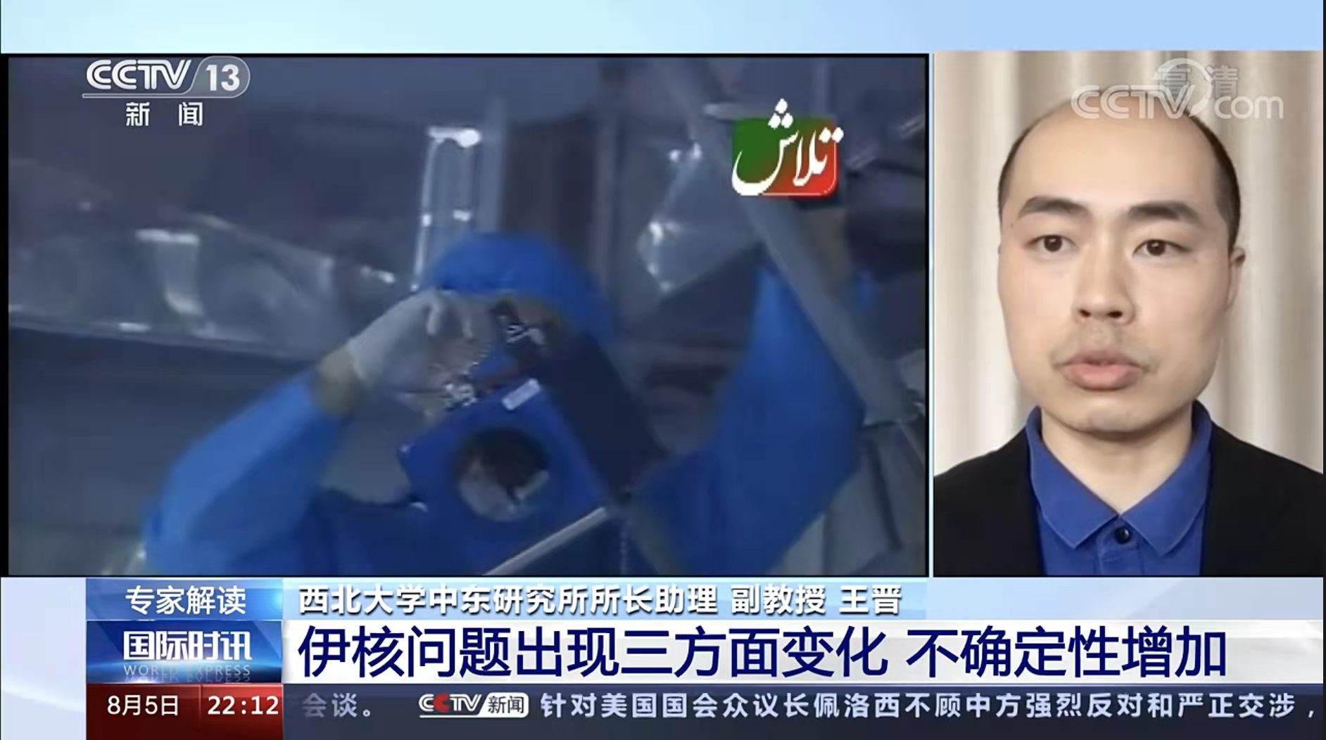 2022年8月5日,中心研究员王晋,就伊朗核谈判,接受了中央电视台新闻频道(CCTV-13)“国际时讯”的采访。王晋认为,伊朗核谈判,将很可能是2021年4月以来最后一次谈判,伊朗和美国已经作出了多方面让步,但是仍然存在多个分歧,谈判结果将会影响未来中东格局走向。