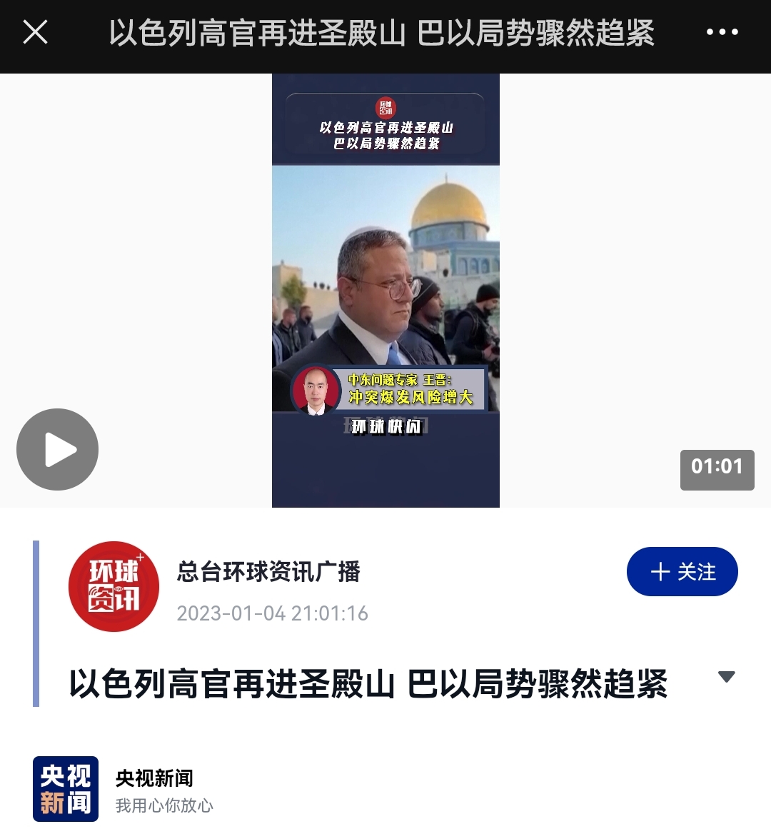 2023年1月4日,中东研究所副教授王晋就巴以问题,接受了中国国际广播电台环球资讯广播的采访。王晋认为,以色列高层访问圣殿山,显示出以色列国内右翼和极右翼政治力量主导以色列政坛,未来巴以冲突必然升级。