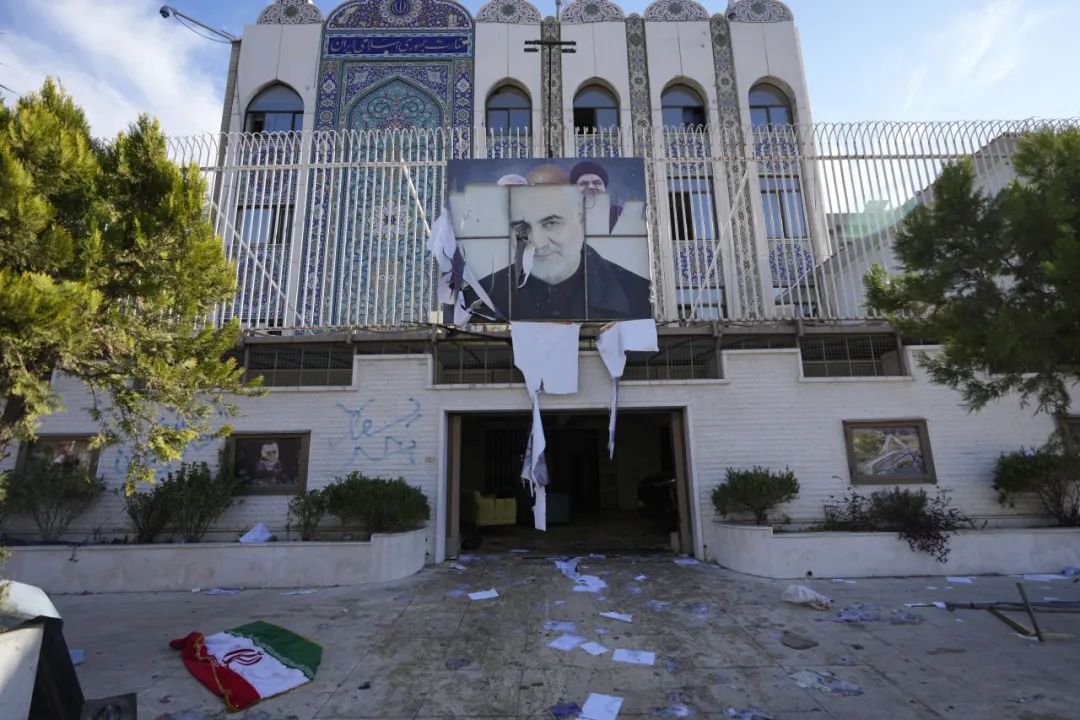 当地时间2024年12月8日,叙利亚大马士革,一面伊朗国旗倒在伊朗大使馆入口处的地上,四周遭到反对派武装人员的破坏。视觉中国/图
