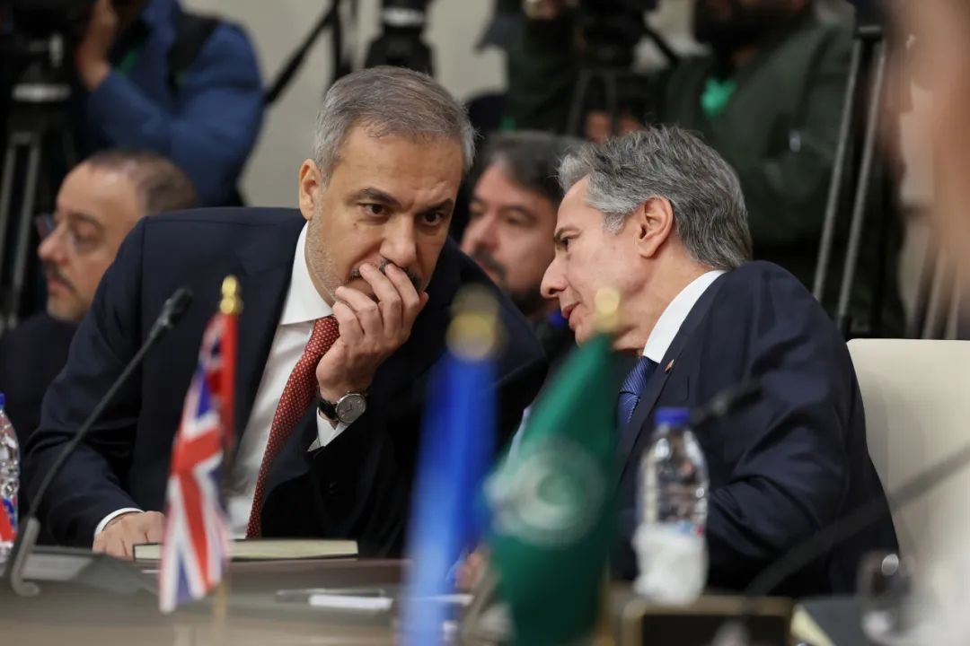 当地时间2024年12月14日,约旦亚喀巴,土耳其外交部长哈坎·菲丹出席以叙利亚为主题的会议,与美国国务卿安东尼·布林肯交谈。视觉中国/图