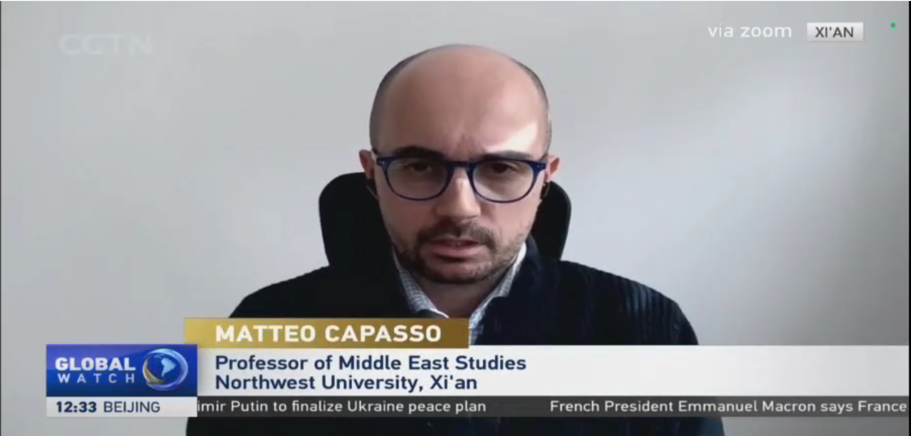 近日,区域国别学院教师马韬(Matteo Capasso)和婉澜(Walaa Alqaisiya)就习近平主席在“声援巴勒斯坦人民国际日”最近声明接受中国国际电视台(CGTN)《全球观察》节目采访。