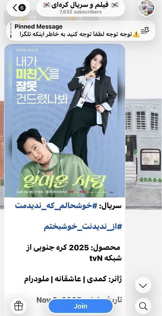 一位伊朗朋友告诉我,现在的伊朗年轻人主要有两个观看韩剧的途径,一是 YouTube,二是 Telegram 群组。目前,伊朗专门翻译和提供韩剧及歌曲字幕的 Telegram 频道有大量活跃成员,仅一个分析韩国电影和电视剧的群组就有近 8000 人,也有专门分享 K-pop、韩剧和日剧的 “最酷网”(jalebtarin)。