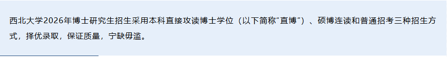 "硕博连读”招生对象为我校在读优秀研究生,报名及相关要求见《西北大学2026年“硕博连读”研究生选拔工作通知》。